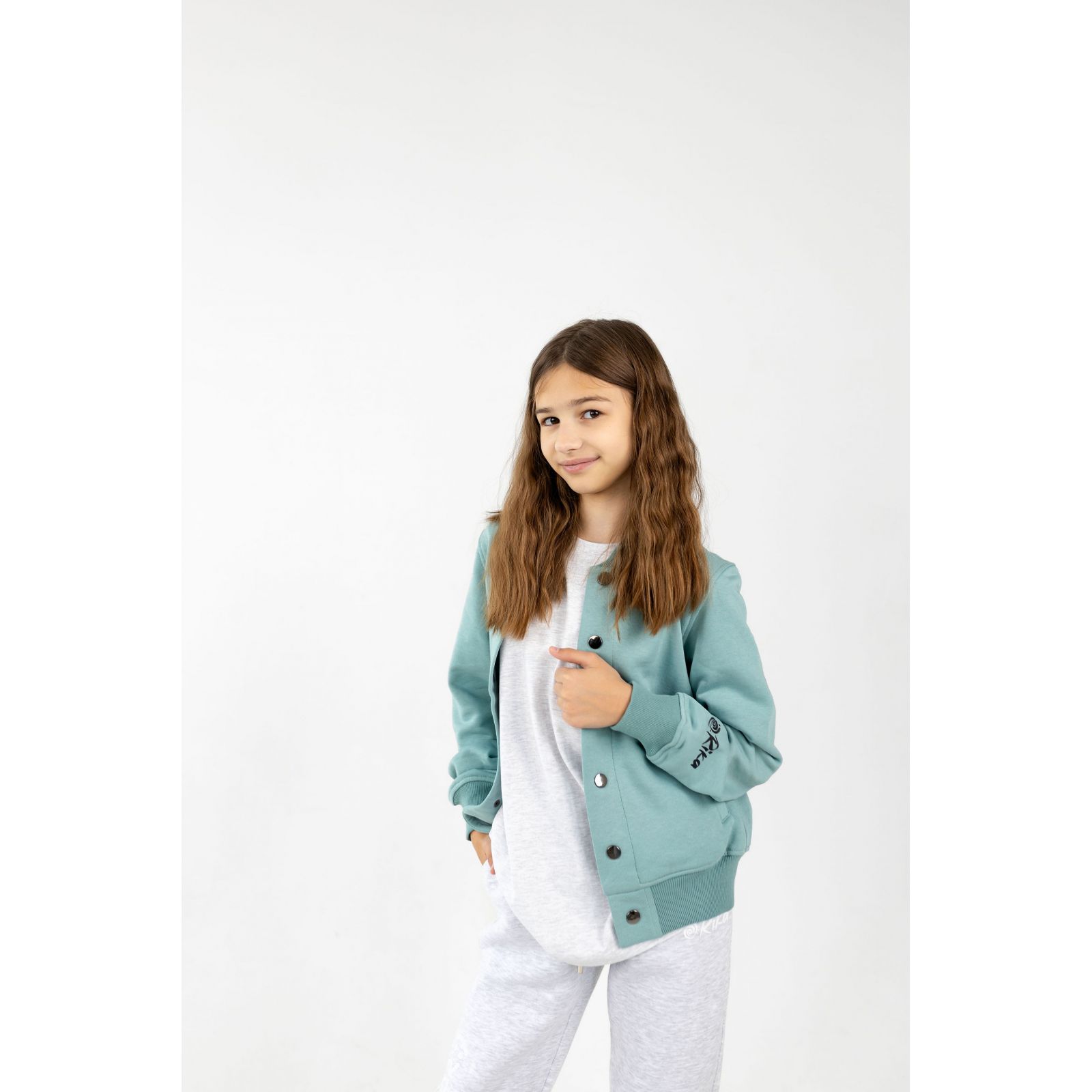 Зручний бомбер з застібкою на кнопках, має дві кишені та принт на спині.