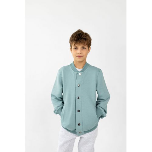 Зручний бомбер з застібкою на кнопках, має дві кишені та принт на спині.