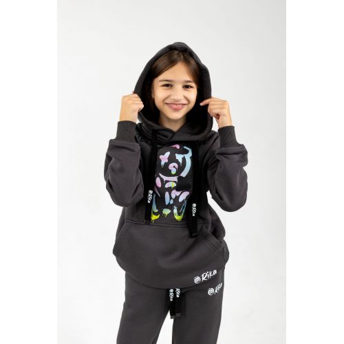 Худі з кишенею-кенгуру, штани на резинці зі шнурком та двома кишенями без змійки. Яскравий принт.